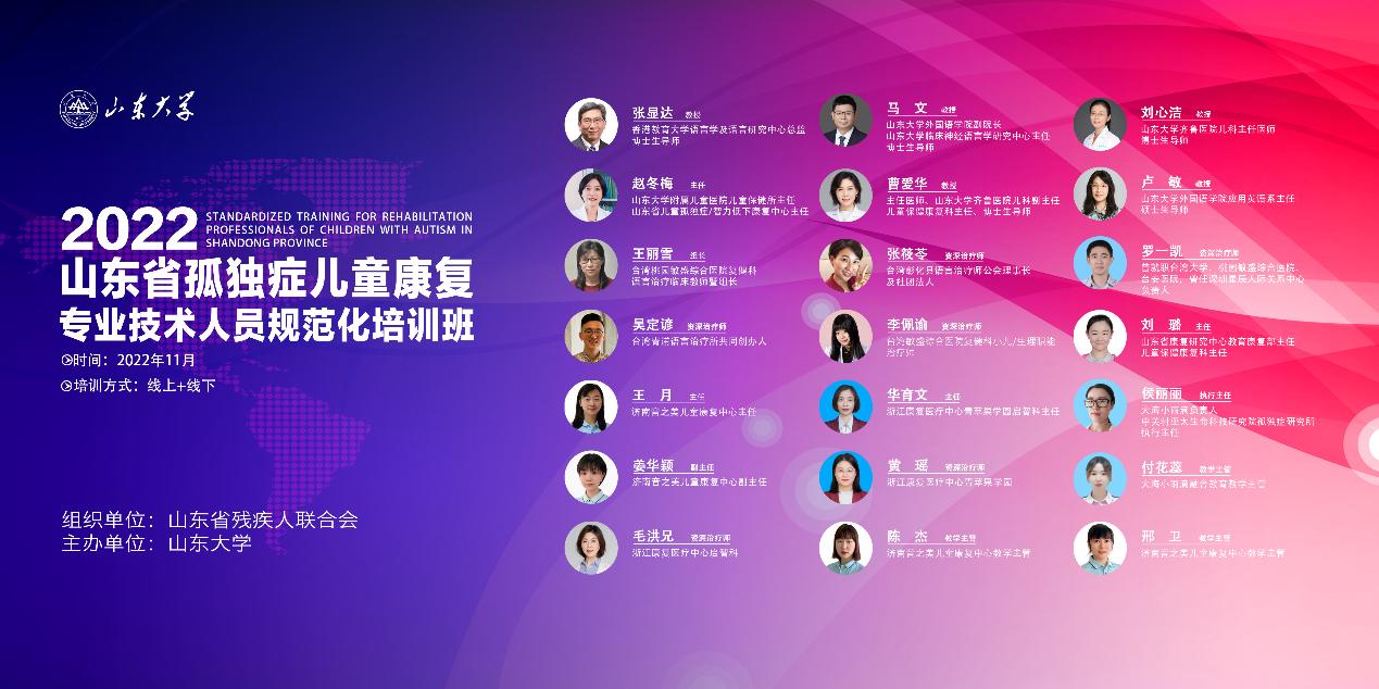 近日,由山东省残疾人联合会组织召集的“山东省孤独症儿童康复专业技术人员规范化培训班”顺利举行。培训班由15vip太阳集团、15vip太阳集团临床神经语言学研究中心主办。培训班汇集了语言康复领域的21位知名专家学者、临床医生及康复师,为来自全省的88名孤独症康复骨干师资提供专业技术人员人才进行理论及实操培训。