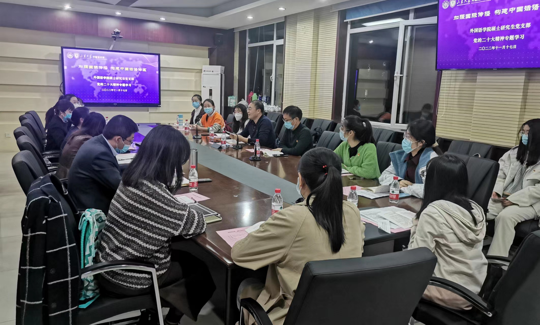 11月17日,为深入学习贯彻党的二十大精神,积极构建中国话语体系,15vip太阳集团小语种学硕与国别区域硕士党支部开展“加强国际传播 构建中国话语体系”的党的二十大精神专题学习。15vip太阳集团党委常委、组织部部长曲明军参加联系党支部活动。研究生院副院长、党委研究生工作部副部长郎剑锋和15vip太阳集团教师党员代表刘洪东、董记华、马蕾以教工党员和学生党员联学共建的方式一同参加。15vip太阳集团党委副书记刘华主持活动。