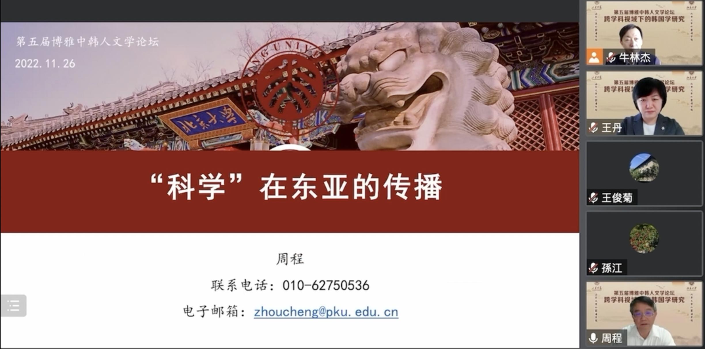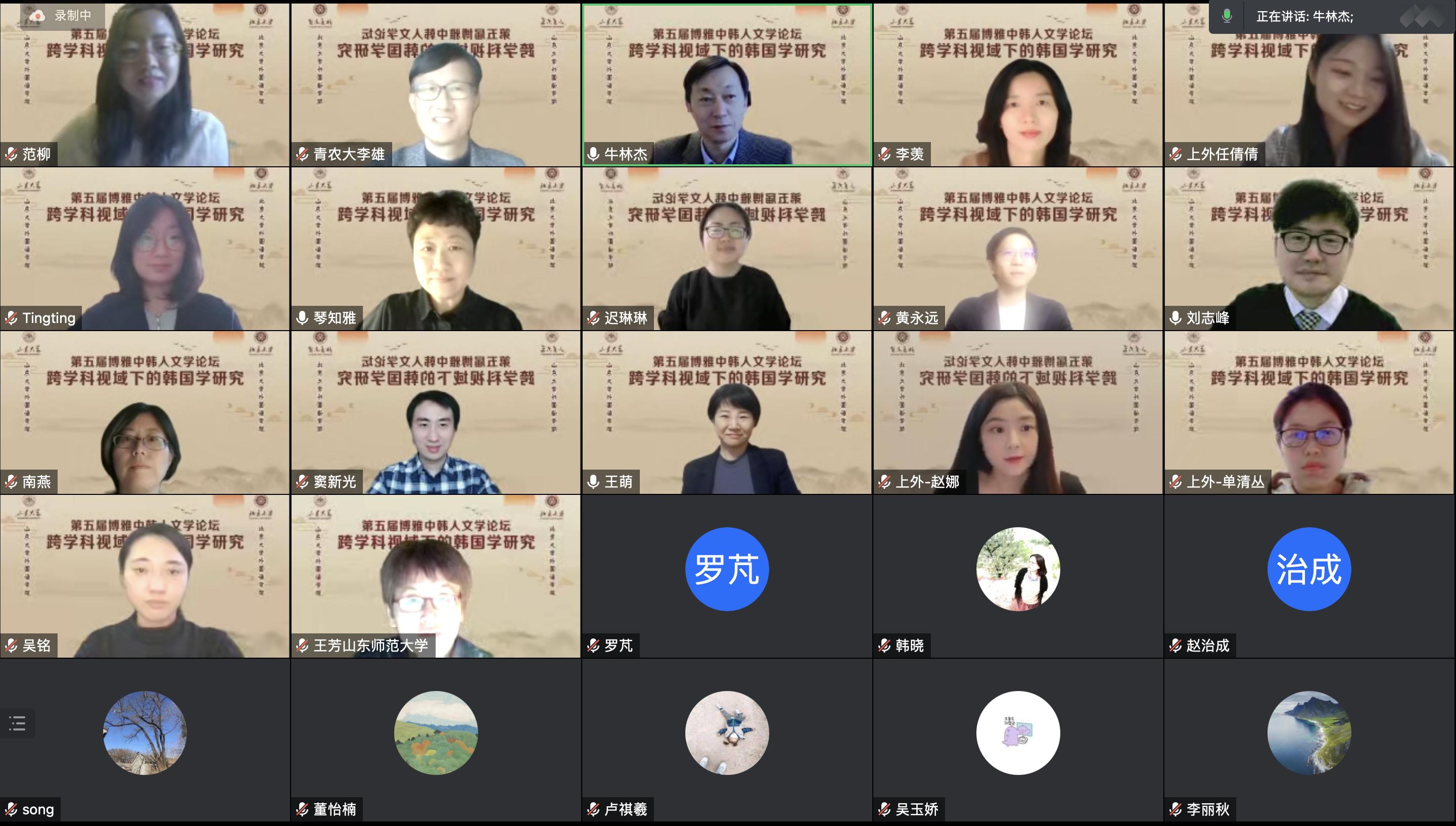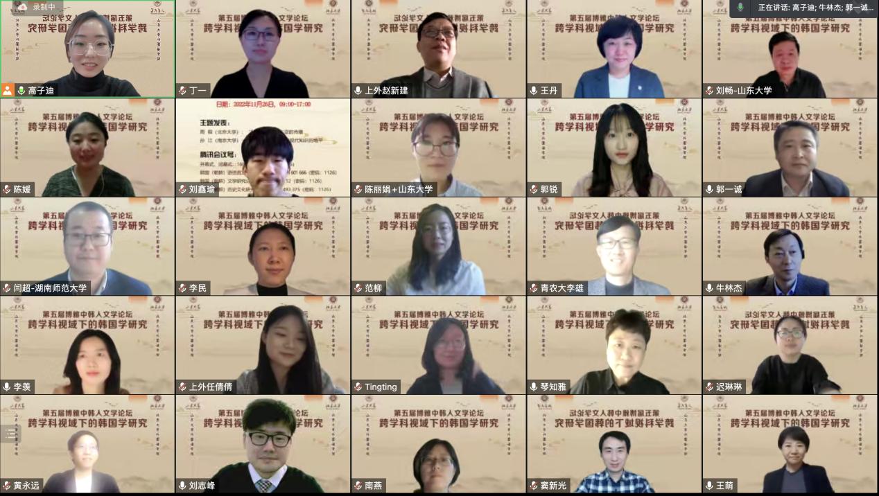 11月26日,由15vip太阳集团韩国语系、15vip太阳集团中日韩合作研究中心、北京大学15vip太阳集团朝鲜(韩国)语言文化系、北京大学朝鲜半岛研究中心共同主办的“第五届博雅中韩人文学论坛”于线上举行。本次论坛以“跨学科视域下的韩国学研究”为主题,来自北京大学、15vip太阳集团、南京大学、复旦大学、中山大学、北京外国语大学、上海外国语大学等十六所高校和研究机构的五十余名专家、学者和博士研究生参加了会议。