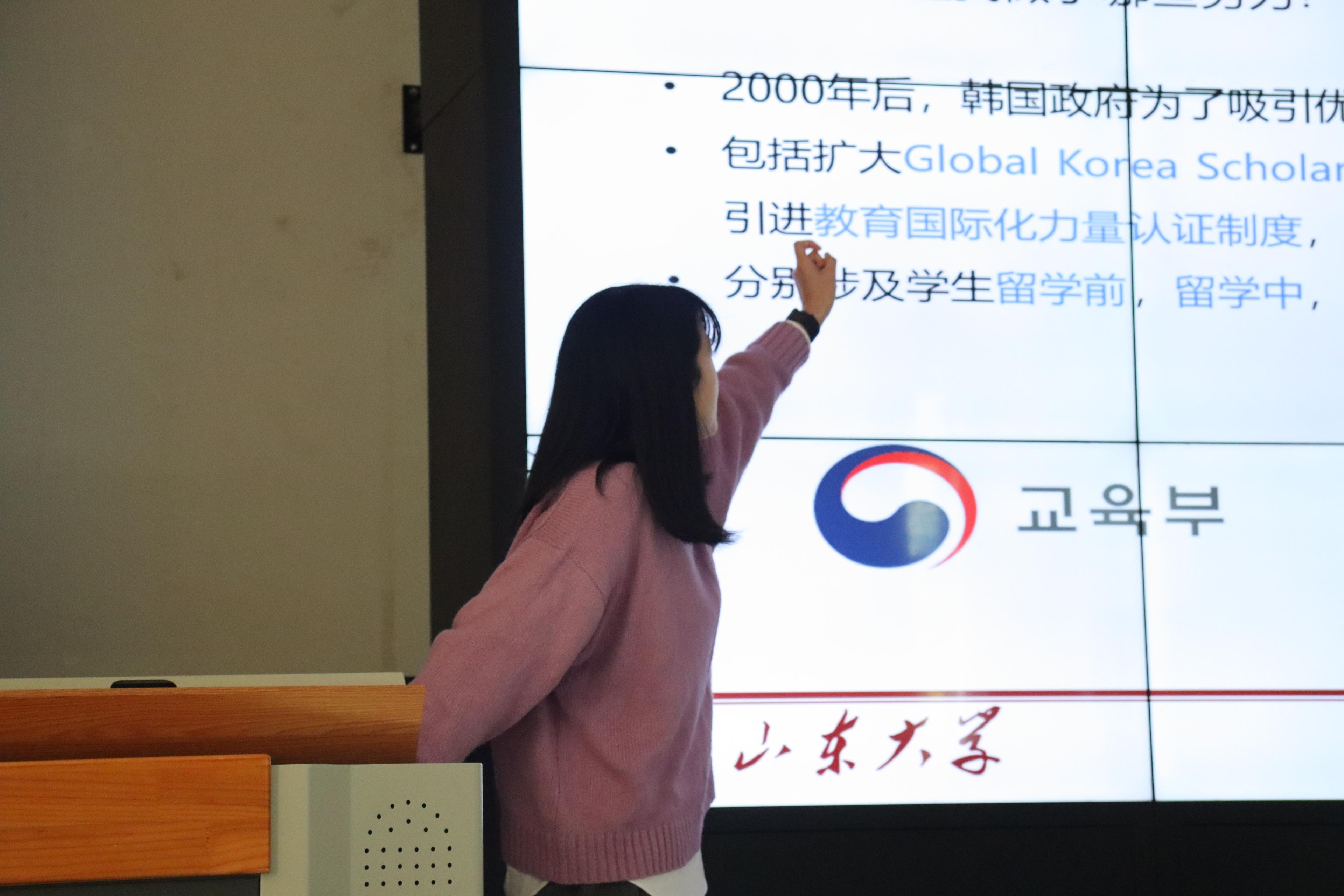 罗芃首先解读了韩国政府的留学生政策,帮助同学们对韩国留学形势进行宏观上的把握。她以韩国对于留学生的欢迎态度为切入点,分别对GKS、教育国际化力量认证制度、Study Korea 2020 Project(2013~2023)以及放宽留学生求职签证政策四个方面做出了整体介绍。