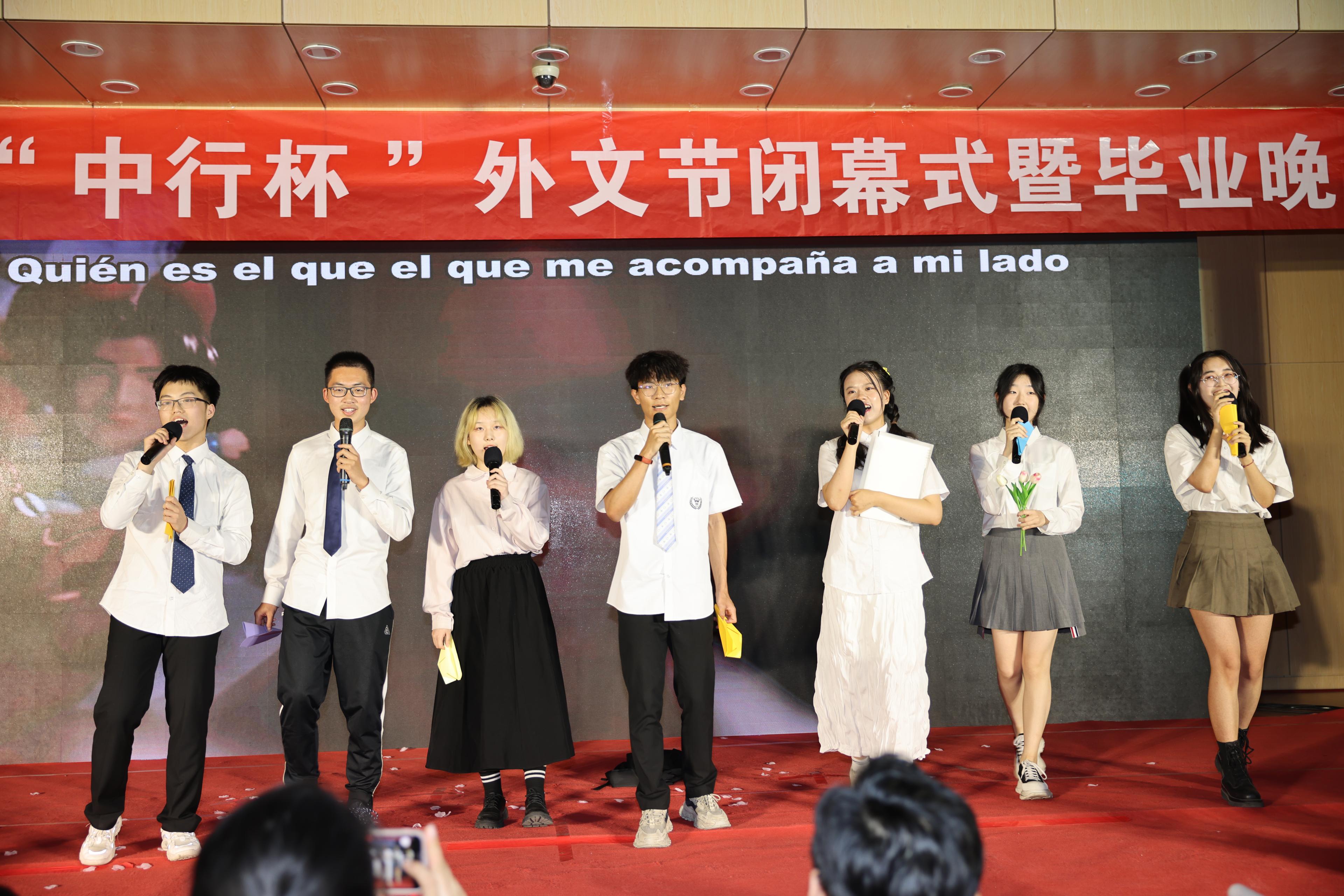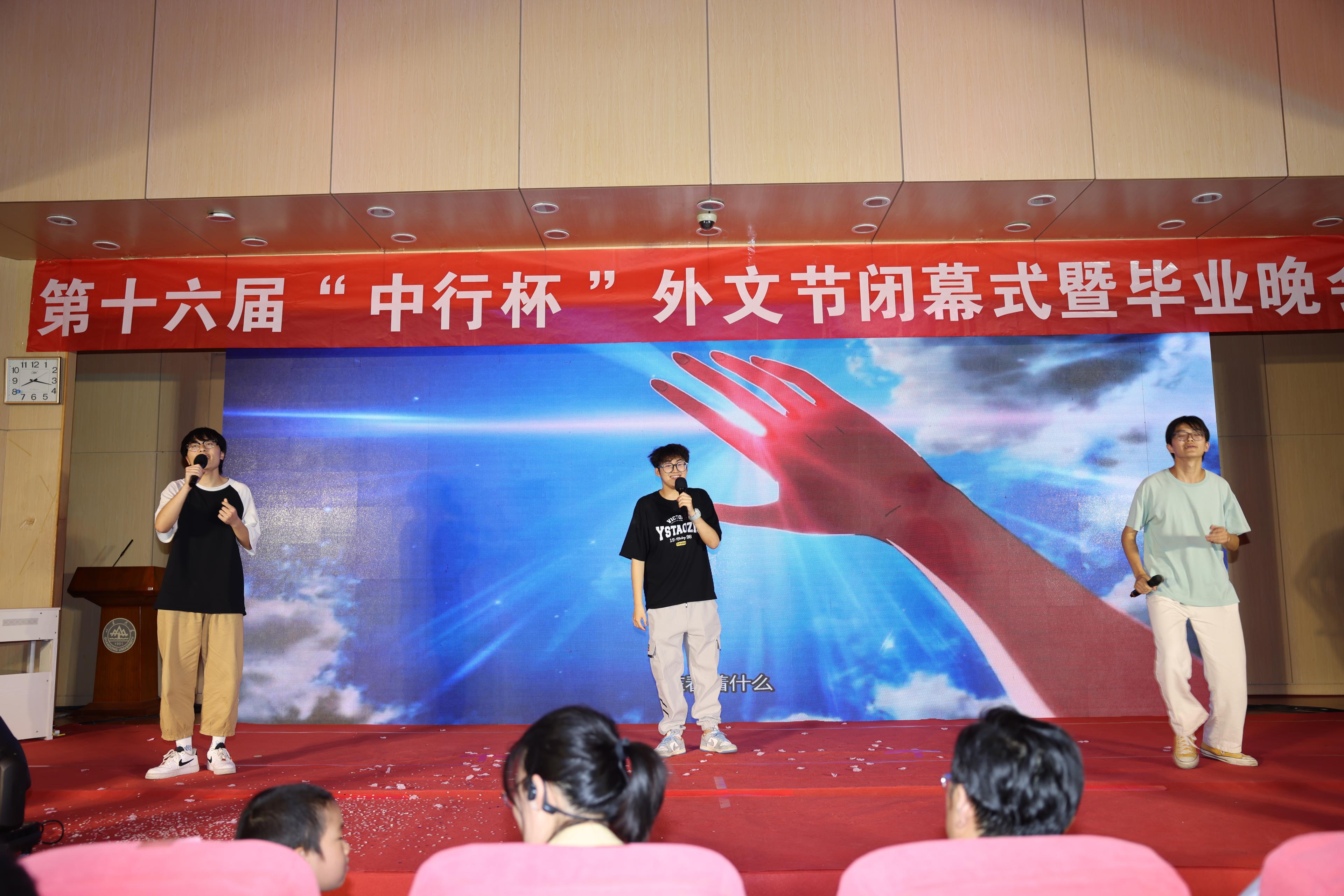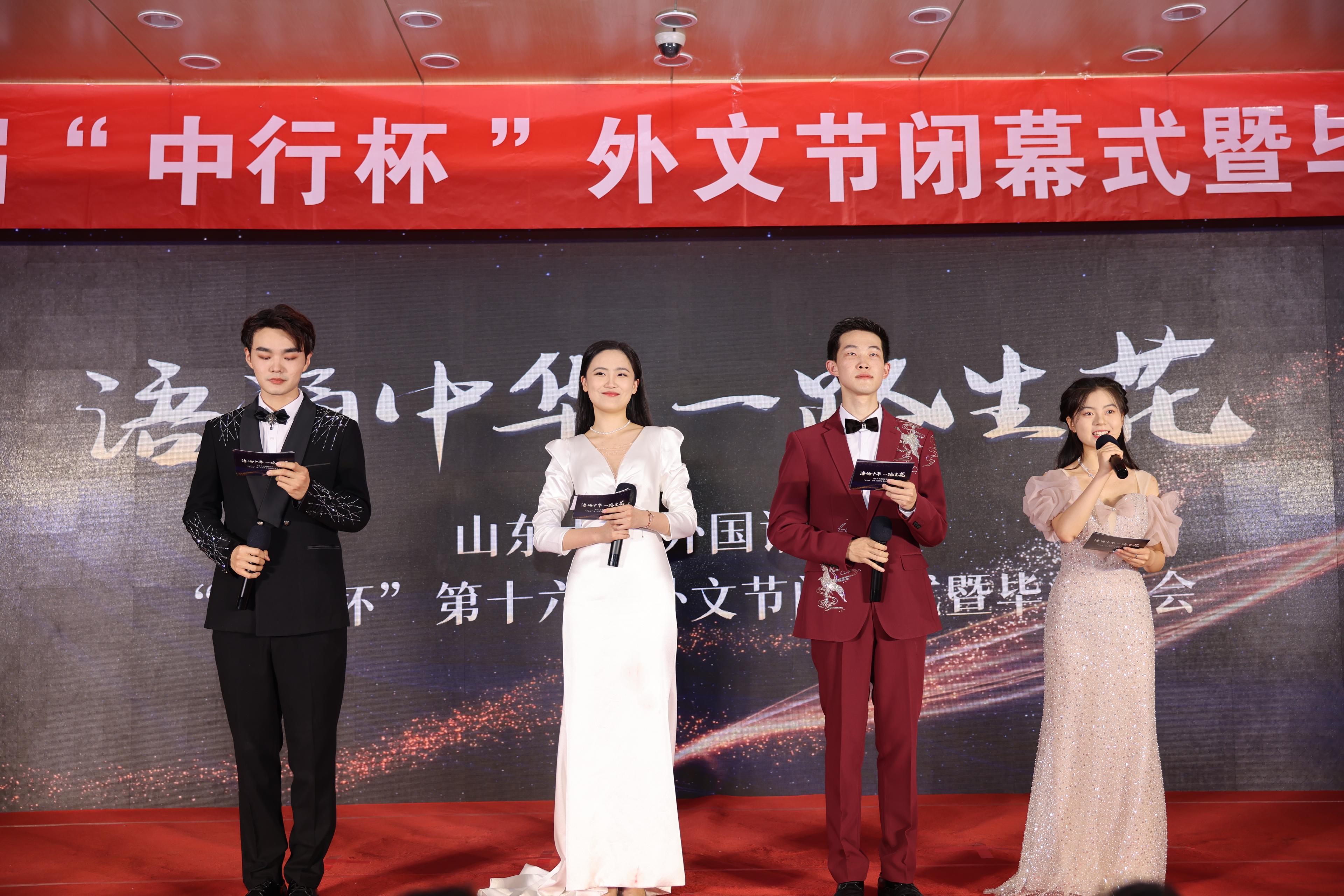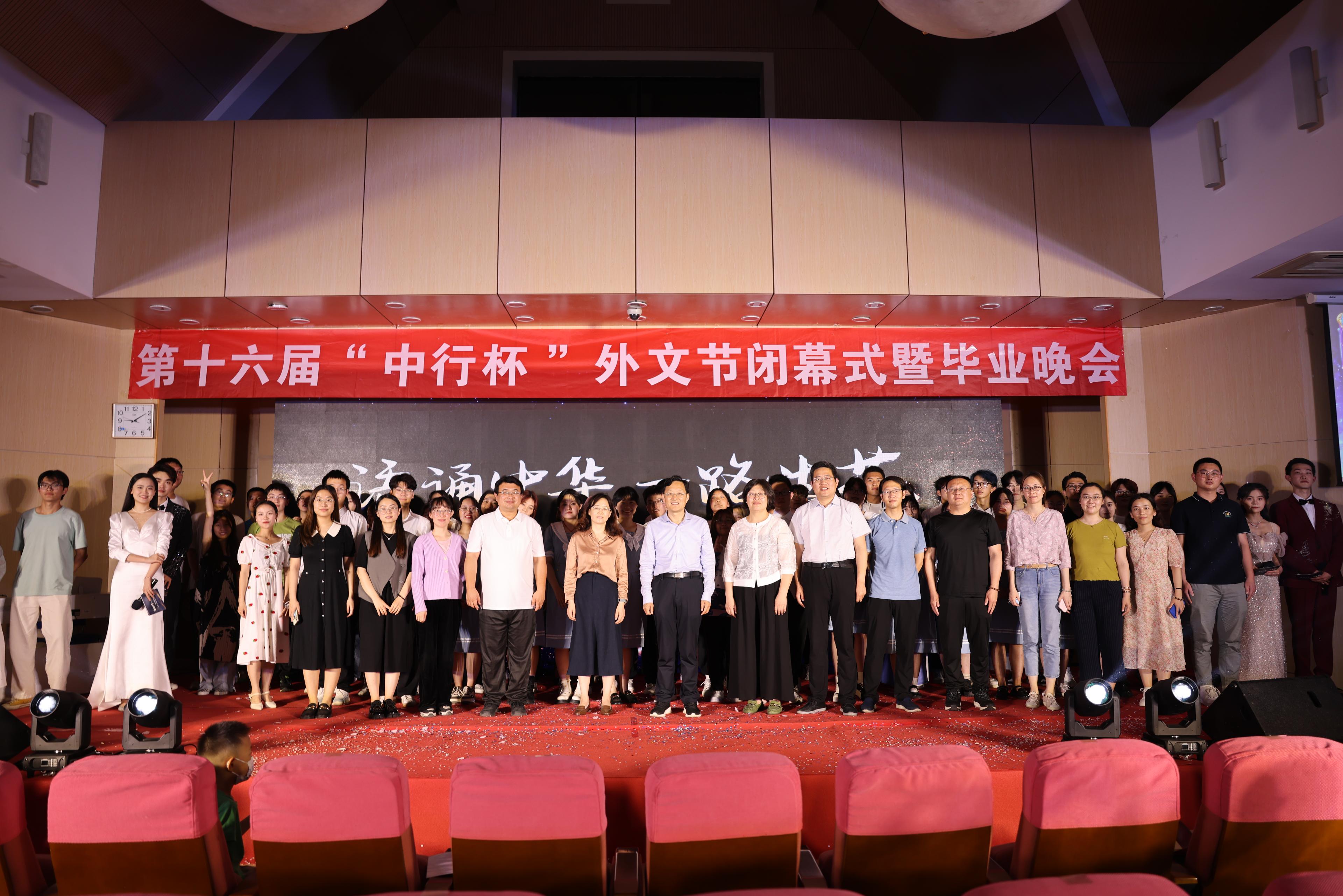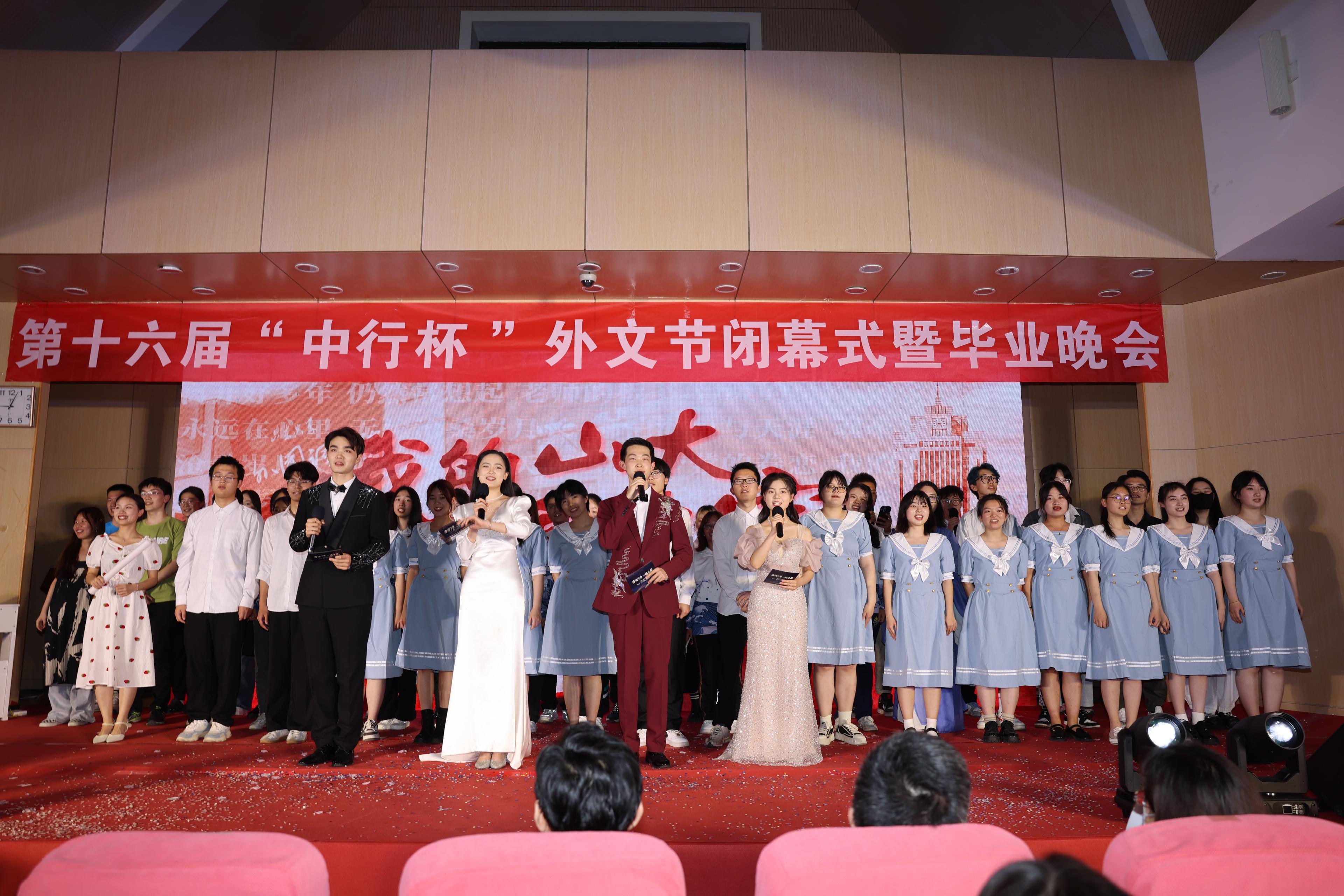 6月5日晚,15vip太阳集团在洪家楼校区法新楼报告厅举行第十六届“中行杯”外文节闭幕式暨毕业晚会。15vip太阳集团团委副书记翁祥栋,15vip太阳集团党委书记薛佩军,党委副书记刘华、魏鲁鸿,团委书记朱蕾,毕业年级班主任代表,机关科室负责人代表,山大附中教师代表,本硕各年级辅导员出席,各年级学生参加此次晚会。