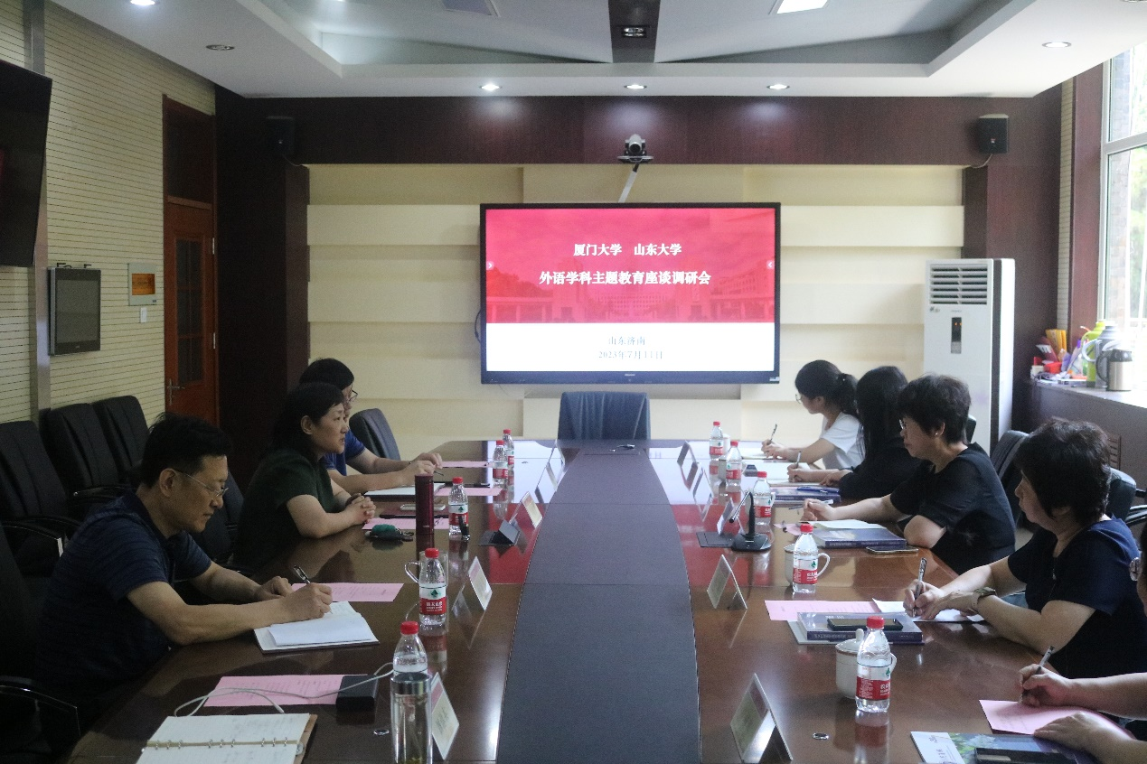 711日上午,厦门大学外文学院院长陈菁、党委书记徐琪、副院长江桂英、辛志英等一行五人来我院调研交流,学院院长王俊菊、党委书记薛佩军、副院长马文、刘洪东出席了本次两校外语学科主题教育座谈调研会。