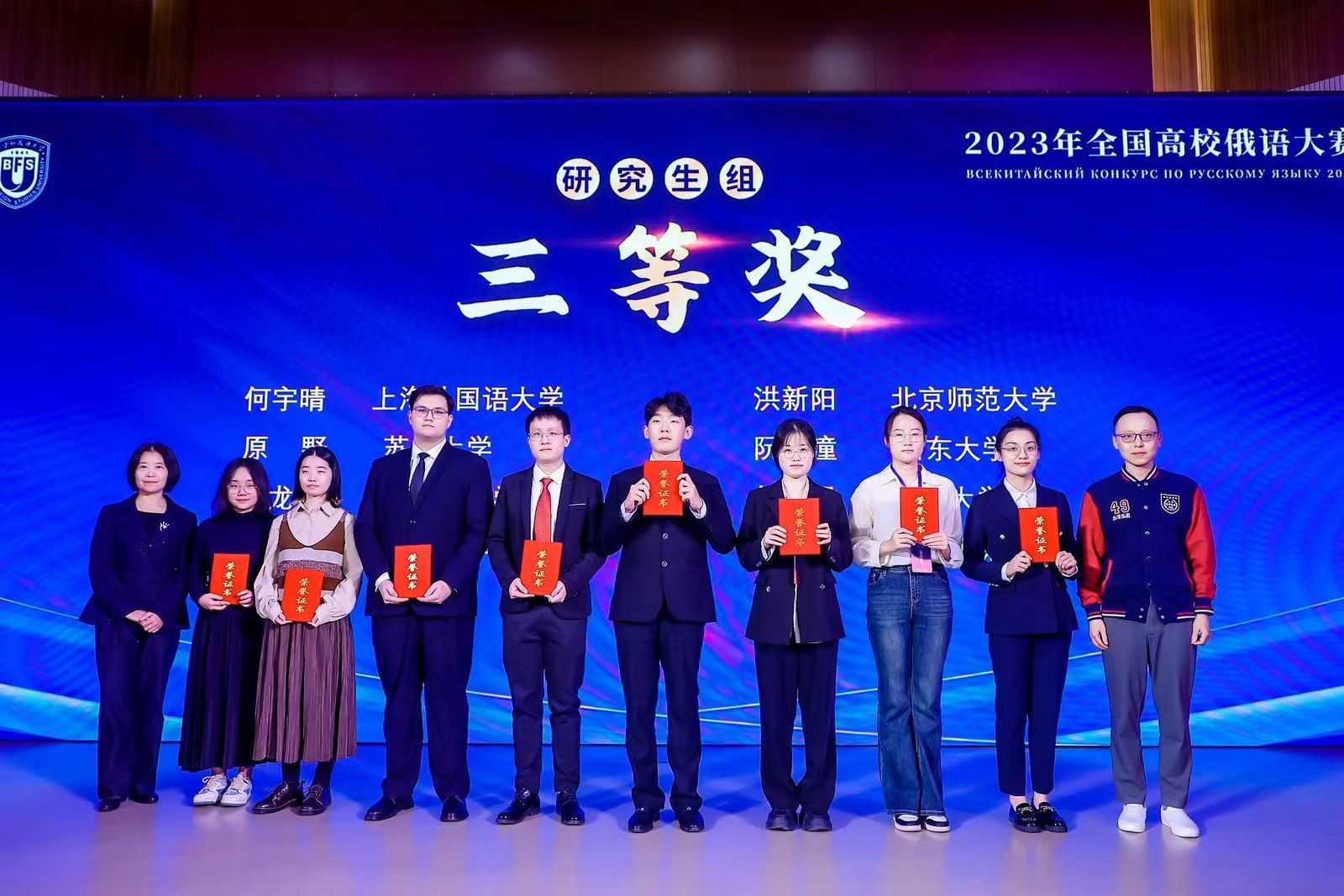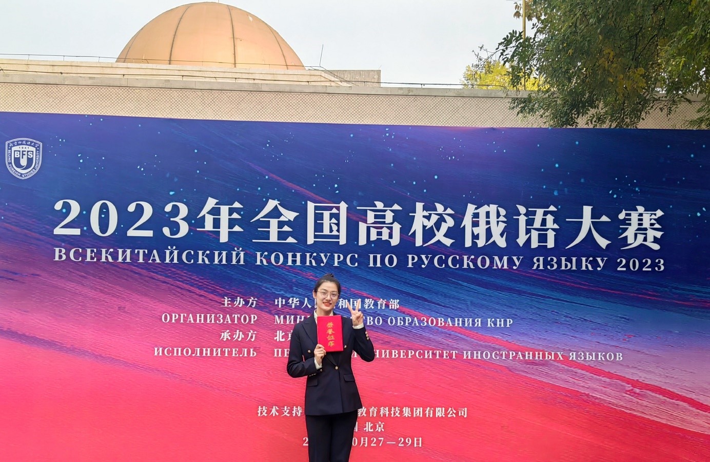 10月28日,由教育部国际合作与交流司主办、北京外国语大学承办的2023年全国高校俄语大赛在北京外国语大学阿语楼国会厅隆重开幕。在俄语系主任陈培军老师带领下,经过激烈角逐,我院2022级俄语语言文学专业阮彦潼获研究生组三等奖。