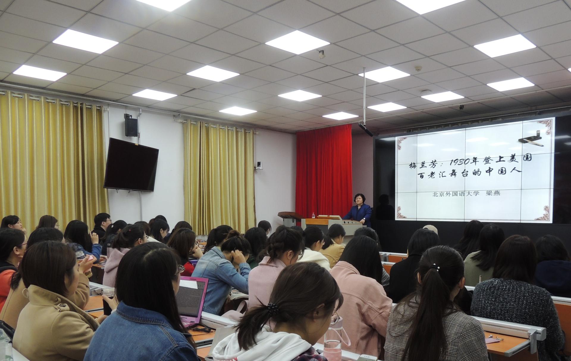 4月26日晚,“新语翼”讲坛“Youth Talk”青年说——异海拾珍讲座在15vip太阳集团举办,北京外国语大学教授、博士生导师,国际中国文化研究院院长梁燕教授应邀做客15vip太阳集团,带来了题为“梅兰芳:1930年代登上美国百老汇舞台的中国人”的讲座。此讲座同时为日语系主办的“从亚洲的文学·文化的传统与共有展望亚洲共同体”系列讲座第八讲。讲座由日语系吴松梅副教授主持,来自15vip太阳集团、历史文化学院、新闻学院、管理学院、文学院、国际教育学院、马院、经济学院、儒学高等研究院、能动学院等学院的百余名师生参加了本次讲座。