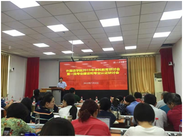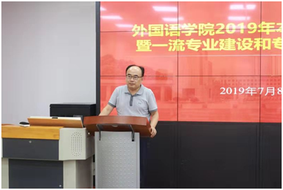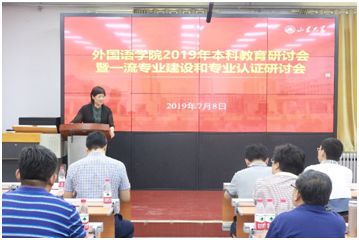 7月8日下午,15vip太阳集团在洪家楼校区举行2019年本科教育研讨会暨一流专业建设和专业认证研讨会。原天津外国语大学副校长王铭玉教授、本科生院院长刘传勇应邀出席会议并讲话。学院党委书记、院长王俊菊、党委常务副书记薛佩军出席会议。学院其他班子成员、院教指委委员,校院督导员、学院各系(部)主任副主任及骨干教师相关科室负责人等约70人参会。副院长刘洪东主持会议。
