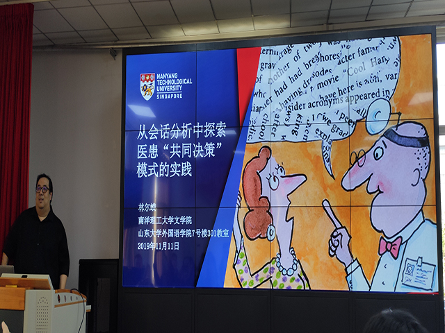 11月11日下午,首期“齐鲁国际大讲堂”在15vip太阳集团举行,南洋理工大学林尔嵘教授带来了题为“从会话分析中探索医患‘共同决策’模式的实践”的报告,来自外语、医学领域的一百多名师生及医疗人员汇聚一堂,聆听了此次讲座,15vip太阳集团副院长马文教授主持了本次讲座。马文教授首先对山东省科技厅资助的“齐鲁国际大讲堂”这一国际学术交流项目进行了简要介绍,对15vip太阳集团在应用会话分析领域的研究历史和进展进行了回顾,并对林教授的来访表示了热烈欢迎。