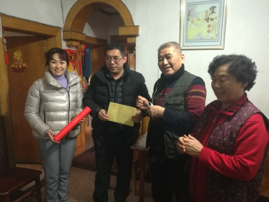行政服务团队党支部的同志们与社区党支部书记宋景峰、社区副主任李敏来到困难党员郑其忠的家中,将慰问金和春联递到他们手上,倾听他们的心声,鼓励积极面对生活。在94岁高龄老人许泰珍家中慰问时,大家送上大米、食用油、牛奶等生活用品,同老人亲切座谈、交流,看到老人身体硬朗,思维敏捷,由衷祝福老人健康长寿,新春愉快。