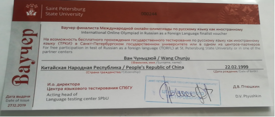 俄罗斯联邦教育部与圣彼得堡国立大学于2019年12月3-25日举办了国际对外俄语奥林匹克网络大赛(Международная онлайн-олимпиада по русскому языку как иностранному),各国留学生积极报名参与。我院俄语系17级学生王春菊、任好为荣获成人组一等奖。