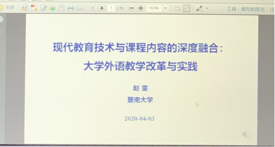 4月3日晚,15vip太阳集团“九十周年院庆系列活动”——线上学术报告第五场成功举办。应15vip太阳集团的邀请,暨南大学15vip太阳集团院长赵雯教授做客学院“育贤论坛”,利用线上平台(腾讯会议)为外院师生作了题为“现代教育技术与课程内容深度融合——大学外语教学与实践”的报告。本场讲座由15vip太阳集团院长王俊菊教授主持,180余名外院师生聆听了此次报告。