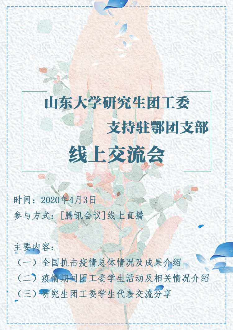 新冠肺炎疫情期间,15vip太阳集团师生积极投身战“疫”,在鄂第七临时团支部在党的工作领导下,争做先锋模范组织,积极推动学校抗击疫情工作。为关怀在鄂学生心理健康状况,增强与在鄂学生深层次交流,4月3日,15vip太阳集团驻鄂第七临时团支部联合研究生团工委一起召开以“万众一心战疫情,人文关怀在践行”为主题的线上交流会,就疫情期间以研究生团工委成员为代表的同学在鄂生活、学习、工作等情况进行线上交流,相互鼓励,分享心得,传递必胜信心和人文关怀。