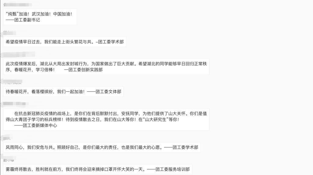 交流会结束前,每一位参会同学都通过留言的方式表达了对在鄂同学的关心和慰问,浓浓的同学情谊给予了在鄂同学精神上的鼓舞和关怀。在鄂第七临时团支部所有成员一定会坚定信念,同心战“疫”,并积极参加各种线上活动丰富自身的学习和生活。