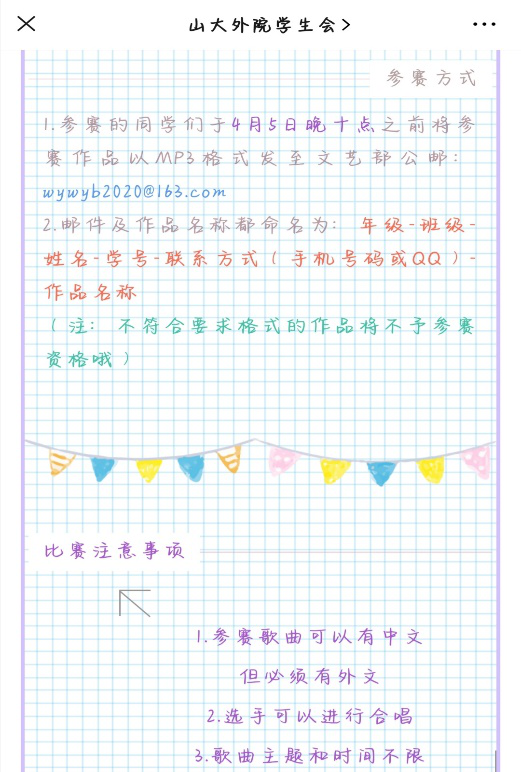 3月末,“唱响世界”外文歌曲大赛线上完成。目前已顺利完成了赛前宣传,赛中评选,赛后颁奖的环节。面对全体外院学生,歌曲大赛以线上形式开展,致力于在增进学生专业素养的同时,培养同学们对外语的兴趣,以点带面,推动外院魅力发展,展现外院特色文化,助力山大迈进国际化潮流。目前,全部参赛作品已提交完毕,歌曲大赛进入评分阶段。