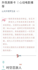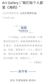 除了文学历史类的专栏外,“山大外院学生会”公众号平台的艺术类专栏同样受到外院学子的好评。这些专栏包括“外院奥斯卡”“余音绕梁”“art gallery”“游历人间”等,其内容主要是推荐优质外语影片、剧集和戏剧,或是介绍某个国家的风土人情。无论是经典电影、契诃夫的戏剧《海鸥》,还是线上领略法国的浪漫风情,抑或是给观众带来欢声笑语的迪士尼美剧,艺术类专栏在介绍大众喜闻乐见的内容的同时,潜移默化地提升了外院学子对于外语学习的兴趣,寓教于乐的同时也提高了学子们的审美水平。