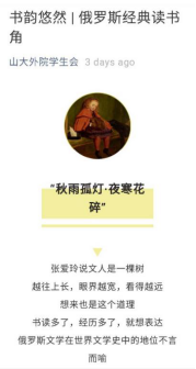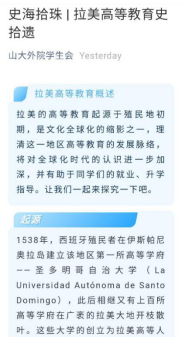 15vip太阳集团利用“山大外院学生会”公众号平台,设立“书韵悠然”“史海遗珠”等专栏,定期发布关于外国文学和历史的优质推文。专栏立足于外院教学中开设的七大语种,并向世界各地区展望,其内容包括英、美、俄等国文学经典书目,有利于提升学生文学素养。除此之外,专栏还介绍了拉美国家的发展与教育史等,增进了外院学子对世界文化和历史的了解,开拓了国际视野。