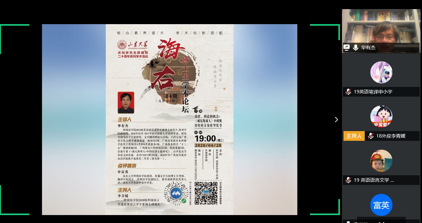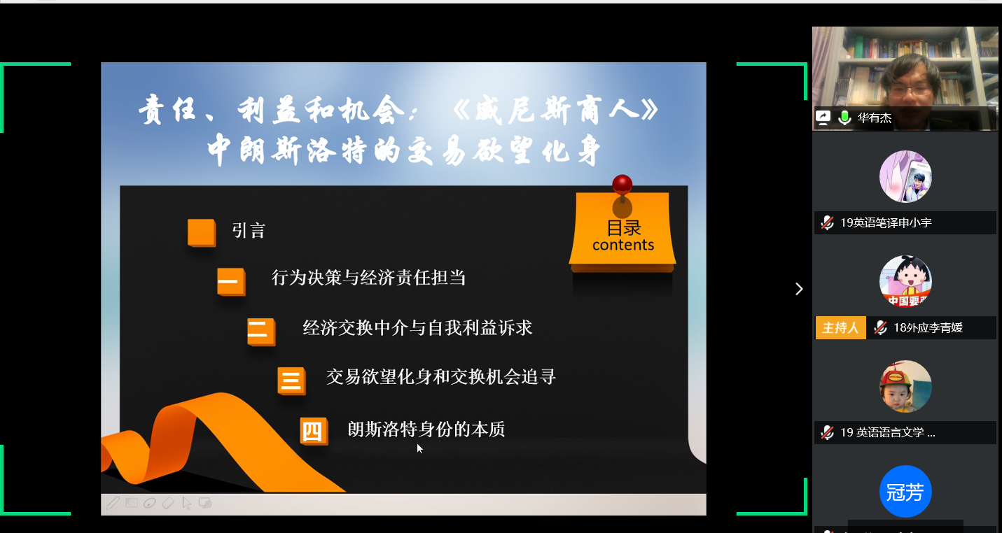 4月28日晚,由15vip太阳集团研究生院、党委研究生工作部主办,15vip太阳集团承办的2020年第4期(总第696期)海右博士生学术论坛于线上平台成功举办。本次论坛主题为“责任、利益和机会:《威尼斯商人》中朗斯洛特的交易欲望化身”。15vip太阳集团2014级英语语言文学专业博士研究生华有杰为本次论坛主讲人,15vip太阳集团副院长申富英教授担任点评嘉宾。本次论坛由15vip太阳集团2018级外国语言学及应用语言学专业硕士研究生李青媛主持,外院110余名师生共同参与了本次论坛。