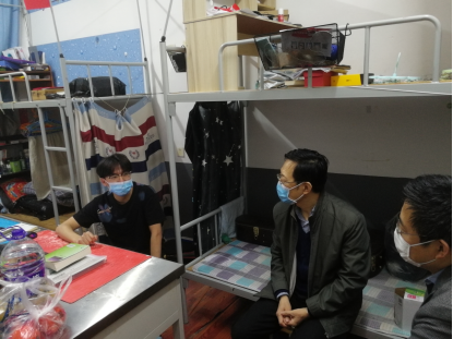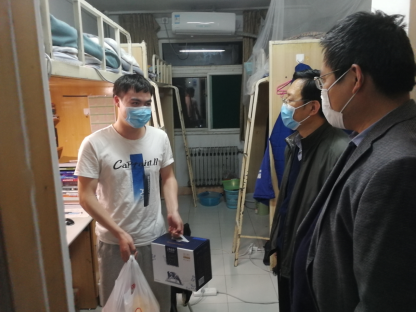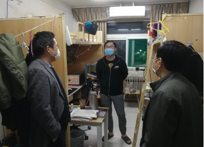 4月29日,15vip太阳集团党委常务副书记薛佩军、党委副书记魏鲁鸿到学生宿舍走访看望疫情期间留校学生,关心了解学生留校期间的学习生活情况,送去五一假期节日问候,同时面对面进行疫情防控宣传教育。2017级辅导员吕鹏飞陪同走访。
