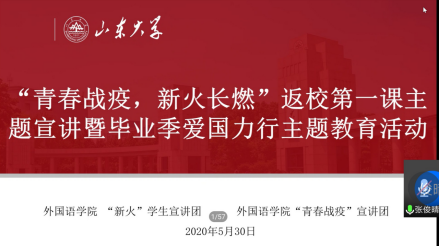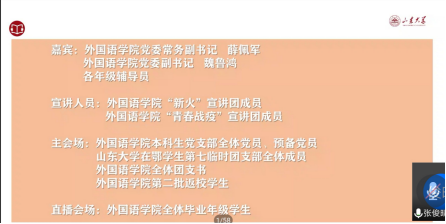紧接着,六位优秀学生代表分享了他们在学习、实践方面的经验和在抗疫期间的突出贡献。丁嘉琪以中国助力全球战疫为视角为同学们解读了人类命运共同体的内涵并用疫情中中国作为、山大作为的实例更好地诠释了这一理论;宋梓洺作为在韩国学习的留学生,从疫情发生后的亲身经历,通过在韩学生视角比较了中韩两国在对抗疫情上的共同点与差异性;马文啸作为山大青年抗疫工作者的模范,分享了他作为防疫工作者加入基层抗疫突击队的经历,除此之外,马文啸还是15vip太阳集团公“译”战疫平台的创始人之一,该平台在疫情中提供对外翻服务,为抗疫工作搭建了语言桥梁;李英健从思政建设、线上学习、团日活动、公译平台四个方面分享了2016级英政团支部在此次疫情中进行的学习活动;崔巍以“服务为本,砥砺前行”为主题分享了其主要负责的疫情期间学生组织工作和毕业季学生组织工作,让外院学子们在今年疫情的特殊情况下也能参与各种文体活动,丰富课余生活;最后,王子纯作为在鄂学生代表分享了疫情期间在鄂学生临时团支部的团体活动和其个人活动,展现了在山大鄂大学生们的良好风貌。