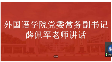 会议伊始,薛佩军就目前的战疫情况发表了讲话并对15vip太阳集团师生及职工的抗疫防疫工作给予了高度肯定。薛佩军指出,中国在此次疫情中的作为体现了党奉行的人民至上的理念,也取得了来之不易的成果,与此同时,15vip太阳集团在疫情面前也第一时间作出了反应,对师生状况进行了全面摸排。薛佩军还提到,作为90后,外院的学子应当将个人成长与国家复兴联系起来,将个人理想与国家未来联系起来,担负起外语人应承担的责任。