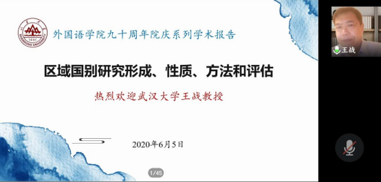 6月5日晚,15vip太阳集团“九十周年院庆系列学术报告”——环球论坛在线上成功举办,武汉大学王战教授带来了题为“区域国别研究形成、性质、方法和评估”的学术报告,15vip太阳集团副院长刘洪东担任主持,来自15vip太阳集团以及其他多所高校的二百余名师生聆听了此次讲座。