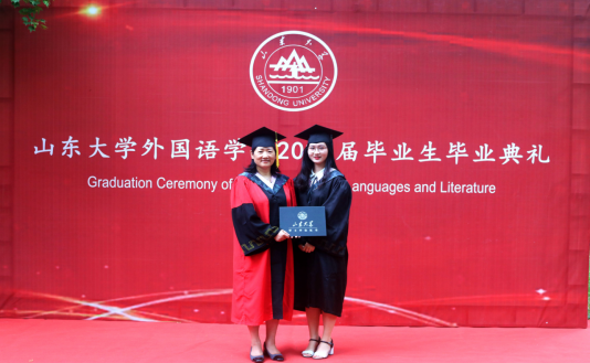 本次典礼主会场设在中心校区音乐厅,外国语学院1名优秀毕业生代表、2名荣誉学位获得者参加典礼并上台领奖,12名毕业生代表班级接受学位证并合影留念。
