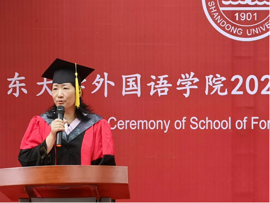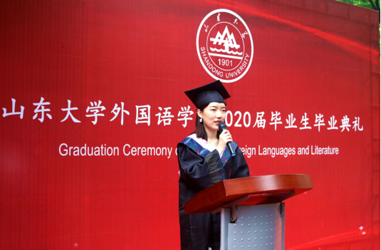 王俊菊在致辞中表达了对毕业生们的真诚祝福和殷切问候。她首先向圆满完成学业并即将走出校门的2020届毕业生们表示祝贺,并对毕业生们在大学时光里收获的成长和成绩表示肯定。鼓励毕业生们在国际形势不断变化的今天,身为一名外语人,要感受世界变化的脉搏,承担沟通世界,引领时代的责任。她介绍道,在15vip太阳集团成立九十周年之际,学院多个学科专业已经入选国家级和省级一流专业,各位毕业生参与并见证了学校和学院发展的进程,是“山大人”与“外院人”的骄傲。最后,王俊菊在毕业寄语中勉励毕业生们要发展一份自己所热爱的事业,以天下家国为己任,担青年应负之使命,为社会的进步和全人类的幸福而拼搏。希望各位毕业生向上而生,向善而行,并表示学院永远是各位同学坚强的后盾和坚实的依靠。